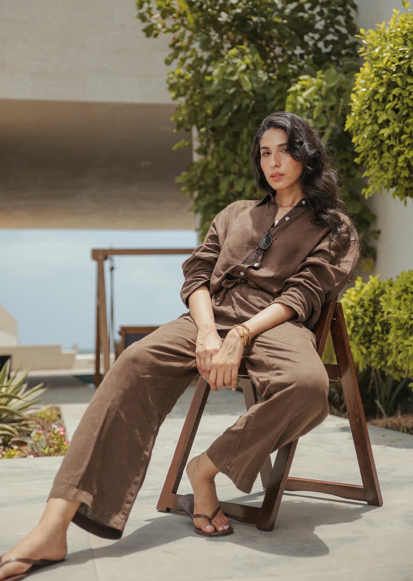 Breathable Linen Set With Long Sleeves Button Down Shirt And Trouser Elastic Waist With Drawstrings