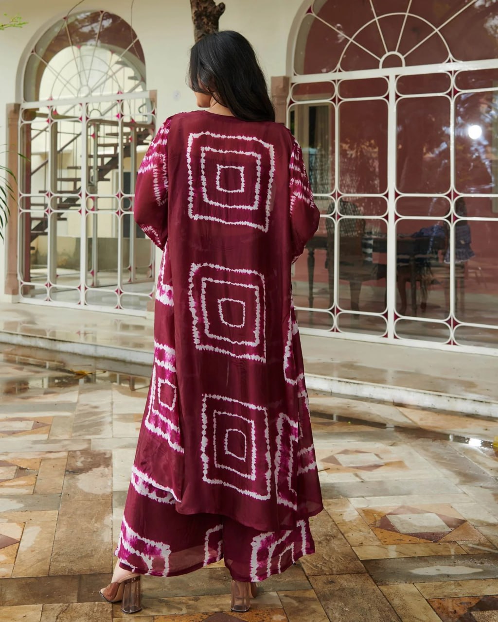 Dive into style with our wine Co-ord Set! This striking three-piece ensemble boasts a captivating blue tie-dye motif that exudes a sense of effortless cool. The dynamic duo of a shirt and sleeveless blouse offers endless styling possibilities – whether you prefer a polished, buttoned-up look for sophistication, or embrace the free-flowing vibe for a carefree and playful edge. Make a statement with every step in this must-have outfit.